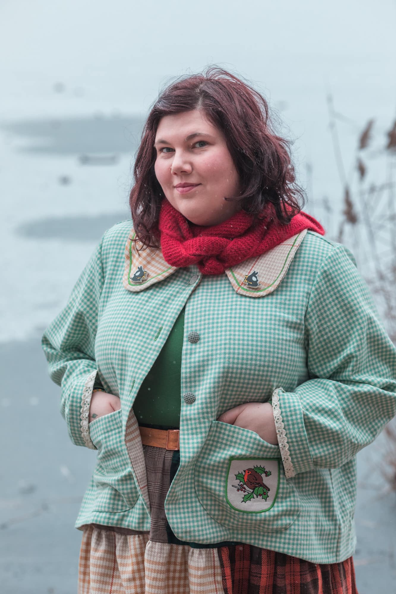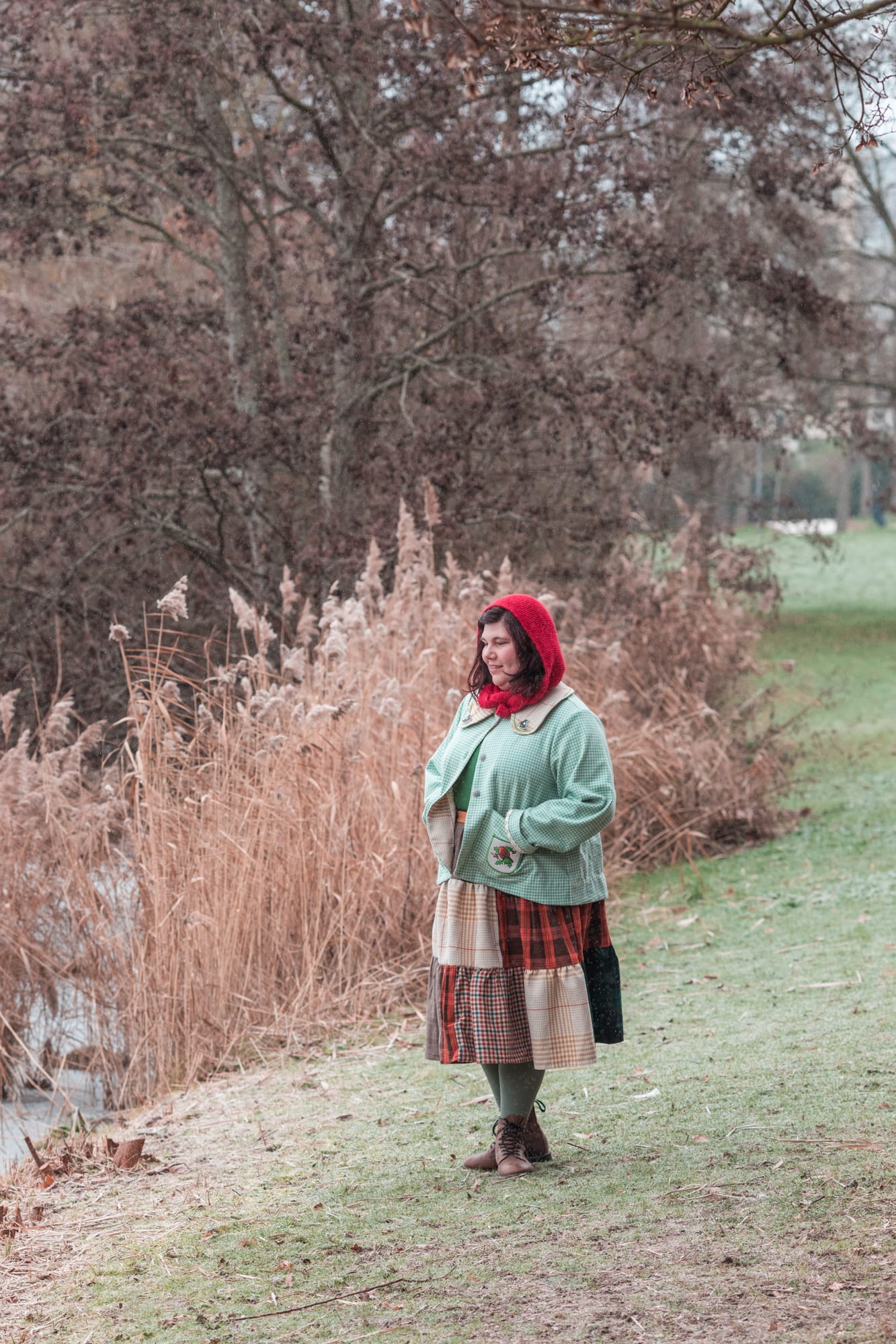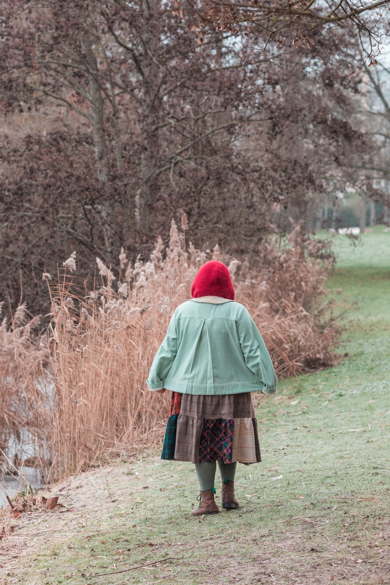 Pour les finitions, j’ai ajouté un liseré vert au niveau du col et des rubans de dentelle pour les ourlets, les manches et certaines finitions intérieures. L’idée était vraiment de partir sur une veste romantique, fraîche et poétique, presque comme une pièce sortie d’un conte moderne.