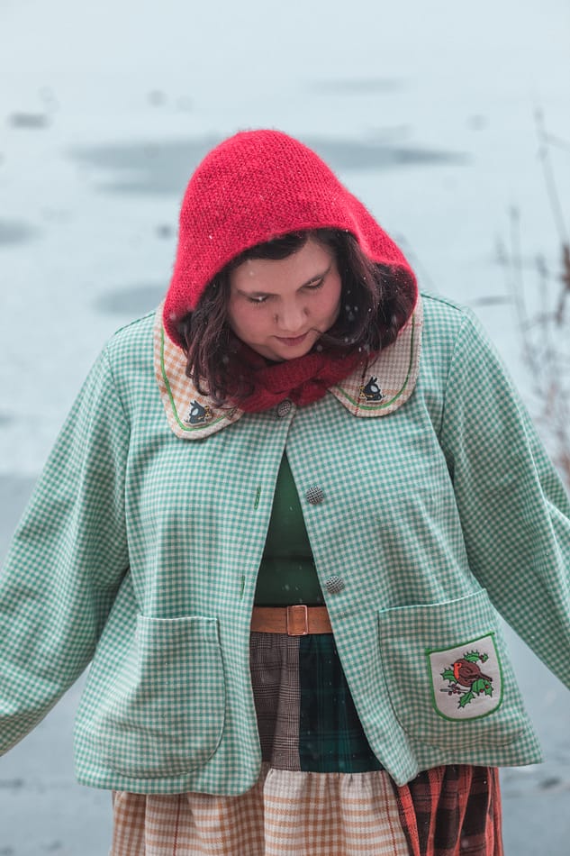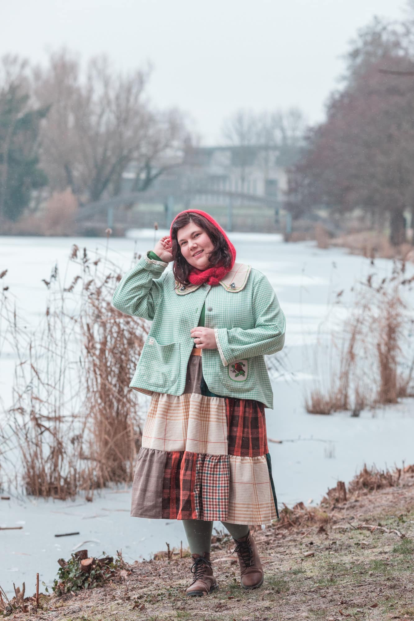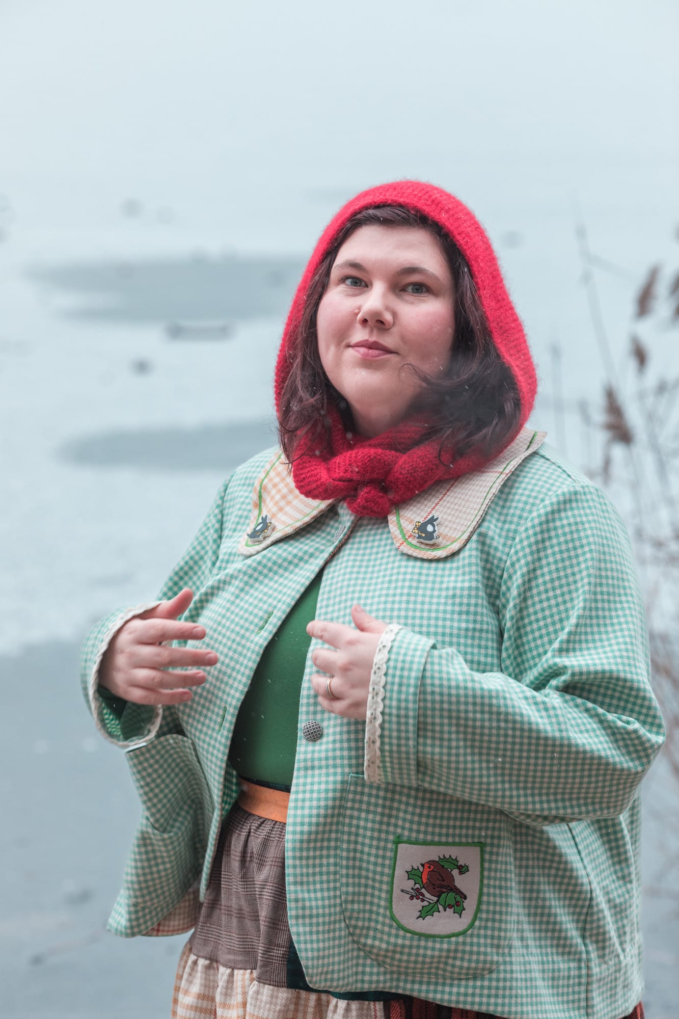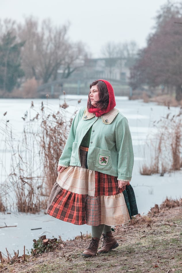 Pour les finitions, j’ai ajouté un liseré vert au niveau du col et des rubans de dentelle pour les ourlets, les manches et certaines finitions intérieures. L’idée était vraiment de partir sur une veste romantique, fraîche et poétique, presque comme une pièce sortie d’un conte moderne.