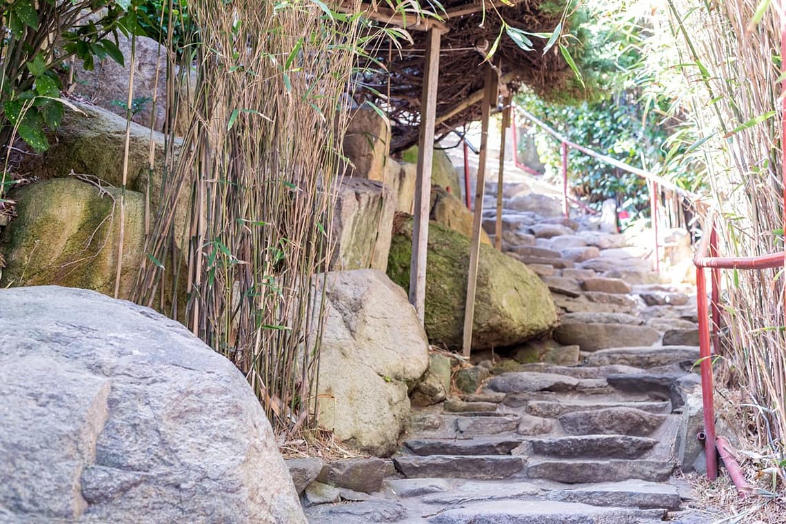 L’ambiance des lieux est légère et joyeuse, on se sent tout de suite calme et apaisé. Les camélias étaient en fleurs, et rappelaient les couleurs joyeuses qu’on retrouvait sur les poutres et sur les plafonds des différents bâtiments qui composent le temple.
