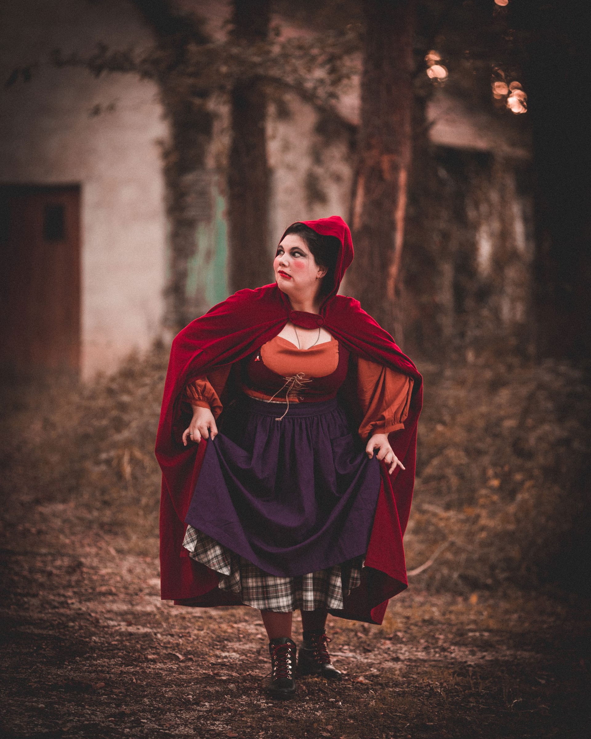Je suis partie sur une blouse orange fluide à manche bouffante, que j’ai cousue en viscose, à partir du patron de la blouse Iris de camélia rose. J’ai complété le haut par un petit veston réversible. Il s’agit du même modèle que celui de Winifred, mais cette fois-ci en bordeaux. Pour le bas de la tenue j’ai cousu une jupe cercle en tartan à partir du parton de la jupe Lily que vous retrouvez dans mon livre coudre body positif. Cette fois j’ai remplacé la ceinture a laçage par une ceinture à dos élastique. Et j’ai fini ma tenue par un tablier en lin violet à cousu à partir d’un jeu de rectangles en tissus.