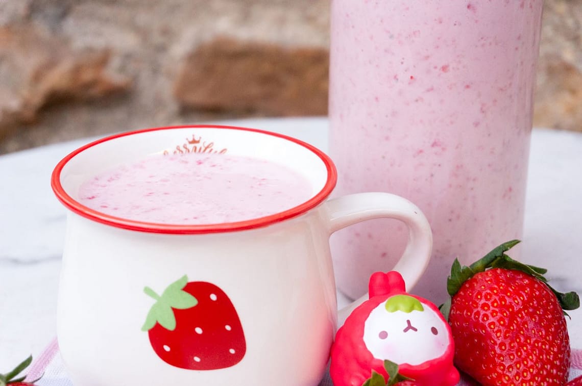 Laver et décortiquer les fraises, puis les placer dans le mixer. Ajouter le kéfir et le sucre. Mixer délicatement afin d’avoir encore quelques morceaux de fraise dans la boisson. Je trouve que les fraises mal mixées donnent un petit plus à la boisson.