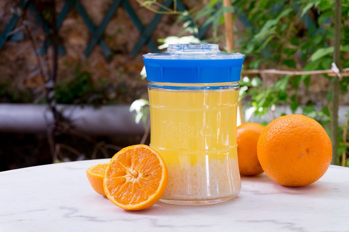 Placer les graines de kéfir d’eau, au fond du kéfiro ou de votre pichet en verre, ajouter le jus d’une orange fraichement pressée et filtrer pour enlever tous résidus de pulpes, afin de ne pas salir vos grains de kéfir. Ajouter une cuillère à soupe de sucre et remplir le kéfiro ou votre pichet d’eau. Le couvrir en laissant un petit espace afin de laisser circuler l’air. Mettre dans un endroit chaud et sombre de 12 à 24 h