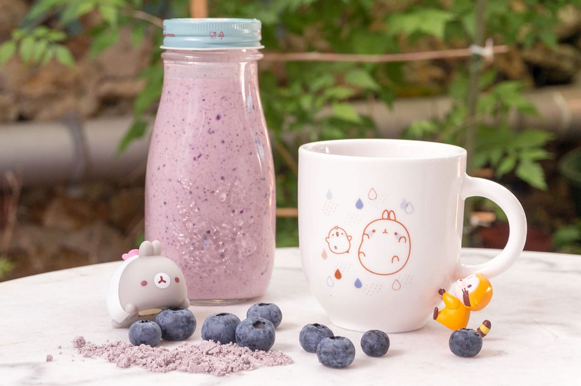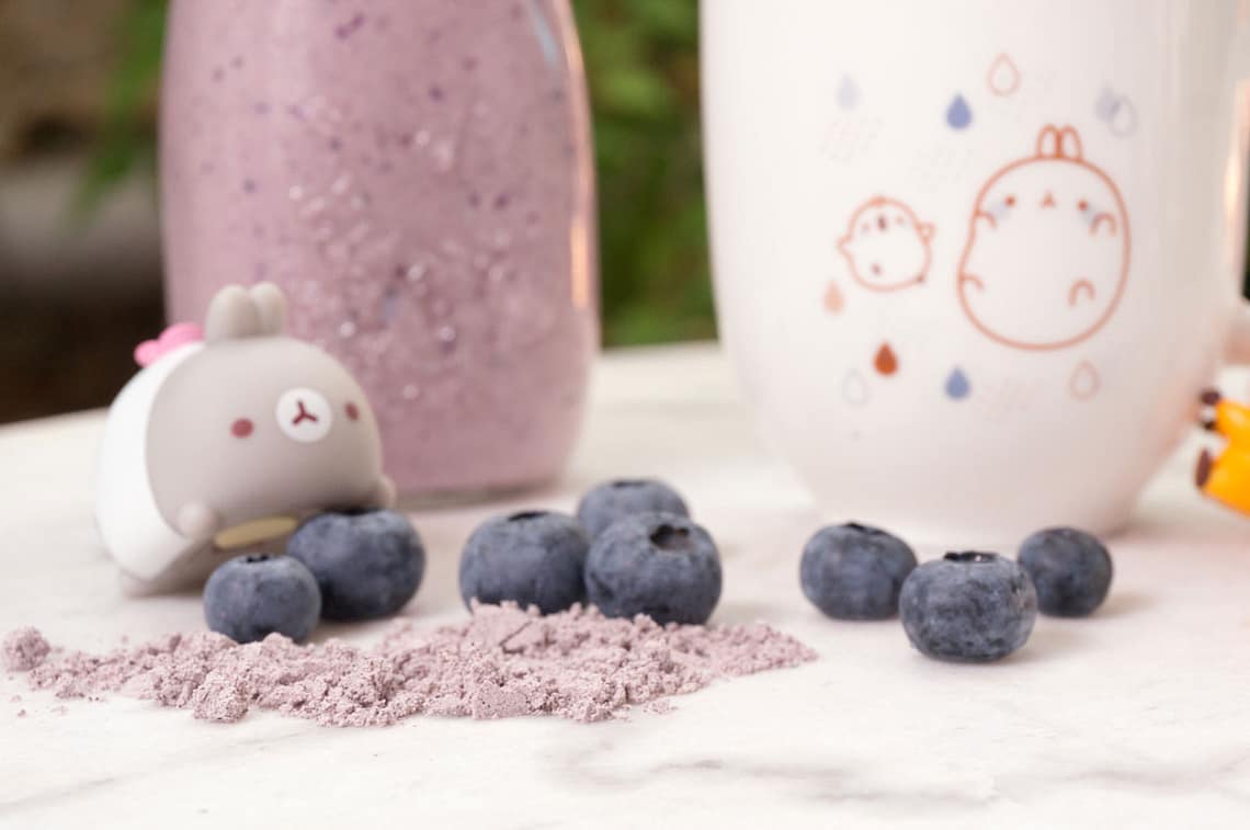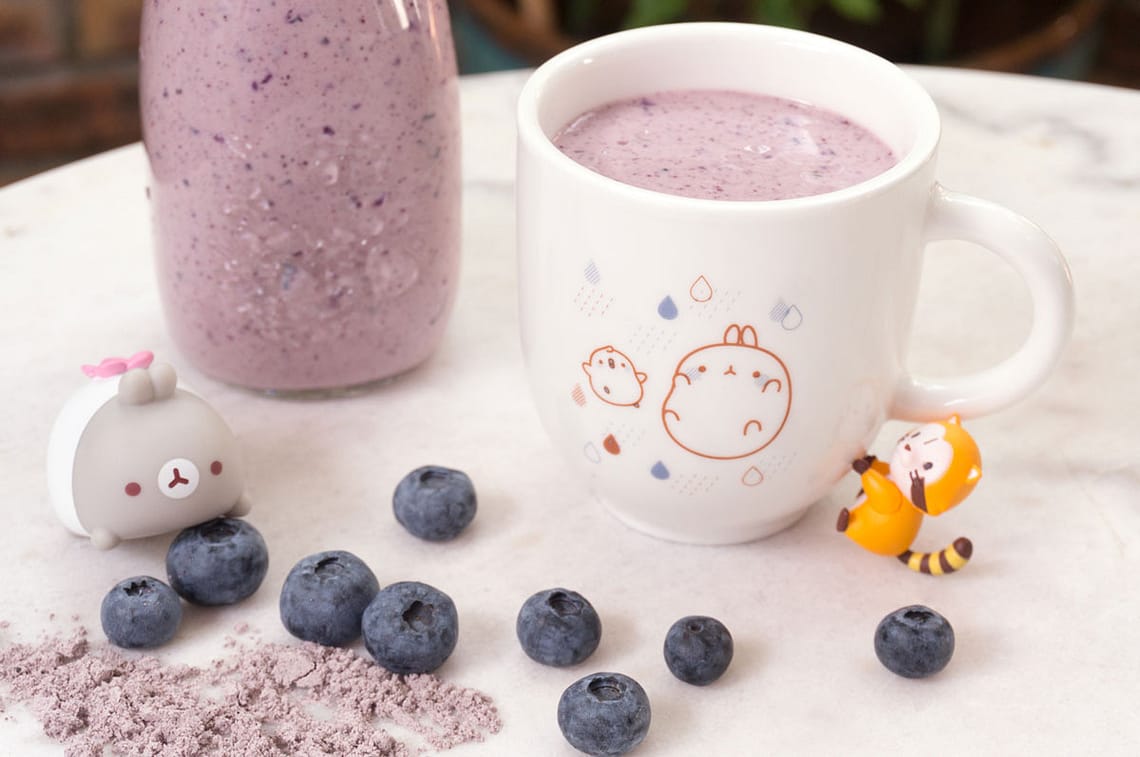 Laver les myrtilles, les placer dans le mixer, ajouter le kéfir, le sucre de coco et la poudre de maïs violet, elle donnera un petit gout de céréale à la boisson. Mixer durant 1 minute.