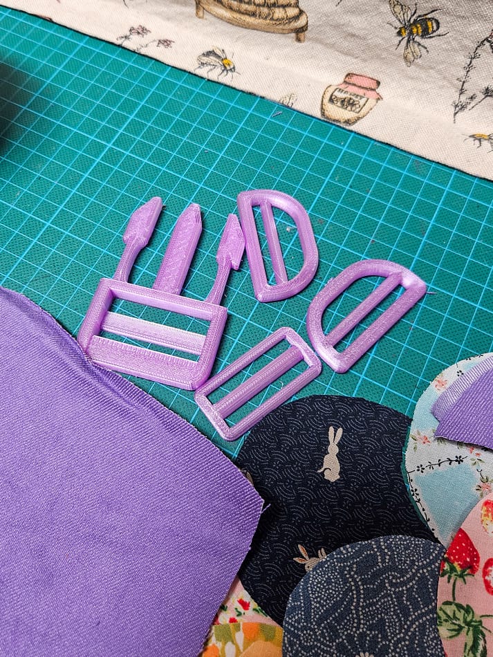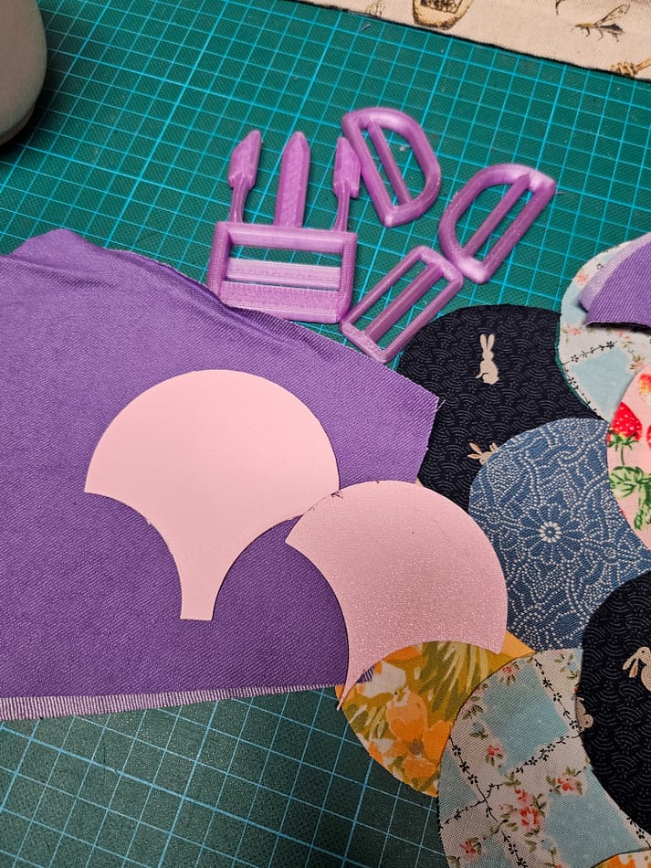 Pour mes coquillages, j’ai modélisé un gabarit que j’ai pu imprimer avec ma Bambu Lab P1S. Ce gabarit en 2 parties, le patron de coupe et le guide de plis, m’a permis d’avoir des formes précises et régulières. J’ai aussi imprimé les boucles et attaches en PETG lilac, et ça c’est la classe !