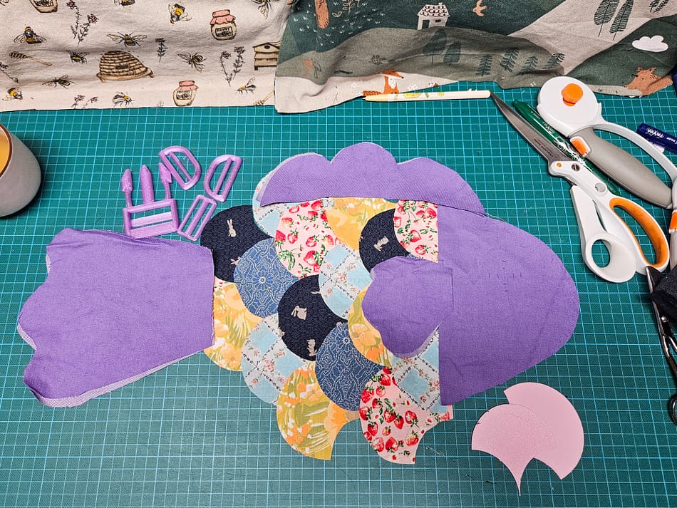Ce patron est déjà conçu pour jouer avec le patchwork et les textures. Sa face avant du poisson est à assembler pièce par pièce. J’ai poussé l’idée encore plus loin en travaillant les écailles en patchwork avec des appliqués coquillages. Entre la découpe, le repassage et la couture des appliqué à la main en point arrière, j’ai passé plus de 12h sur la face avant.