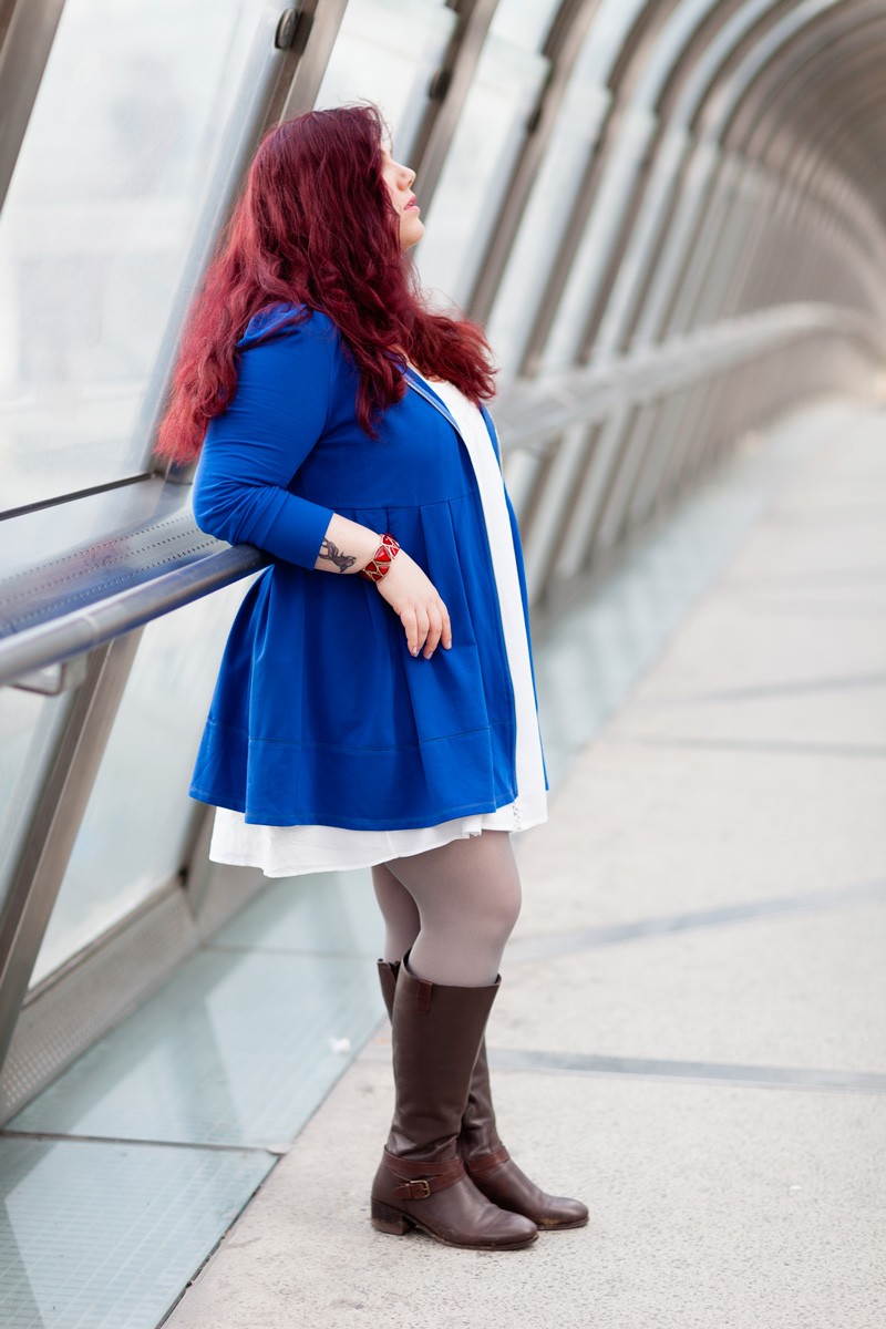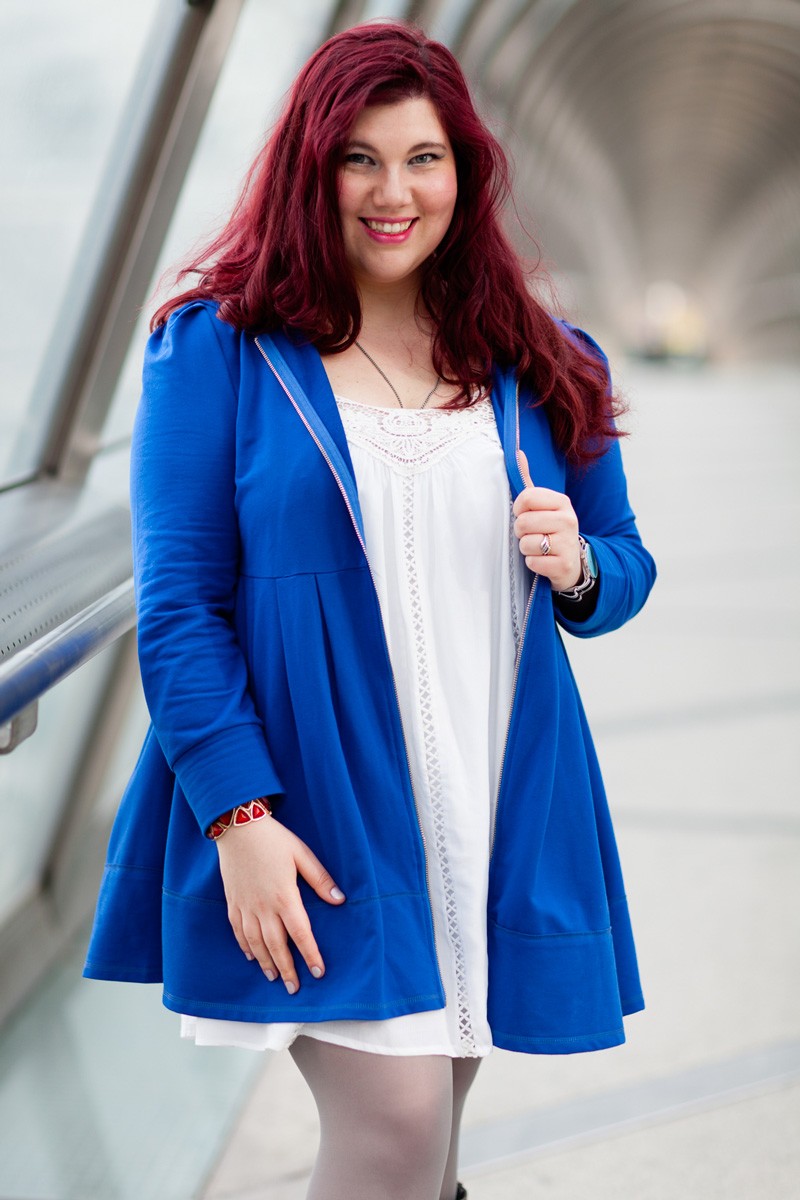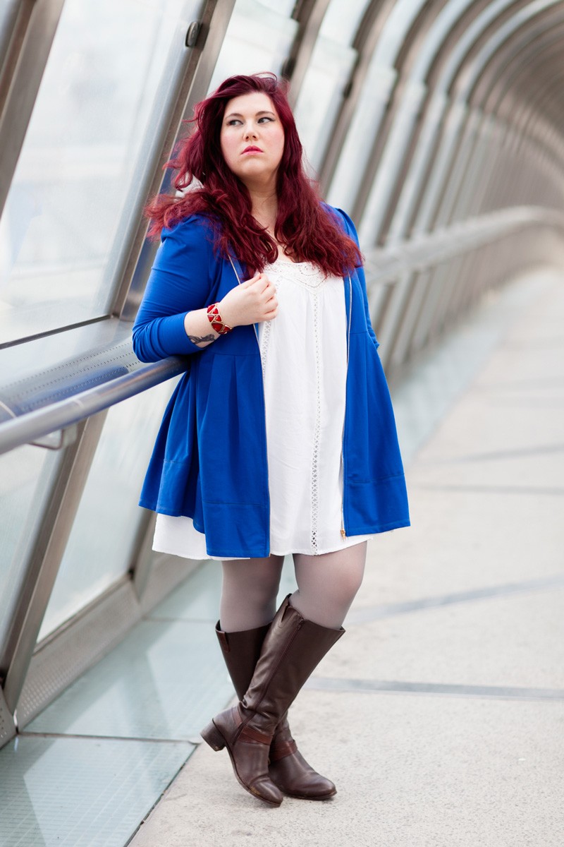 Je suis partie sur une interprétation girly, à l’esprit Jedi, avec un long gilet à capuche bleu roi, dont j’adore la forme, il pourrait être porté comme une petite robe. Une robe blanche style chemise de nuit avec de jolis inserts en dentelles. Des collant gris, et pour finir ma paire de bottes cavalières qui ajoutent un côté combattant Jedi. Je finis ma tenue avec un bracelet rouge pour rappeler le petit bouton rouge de R2D2.