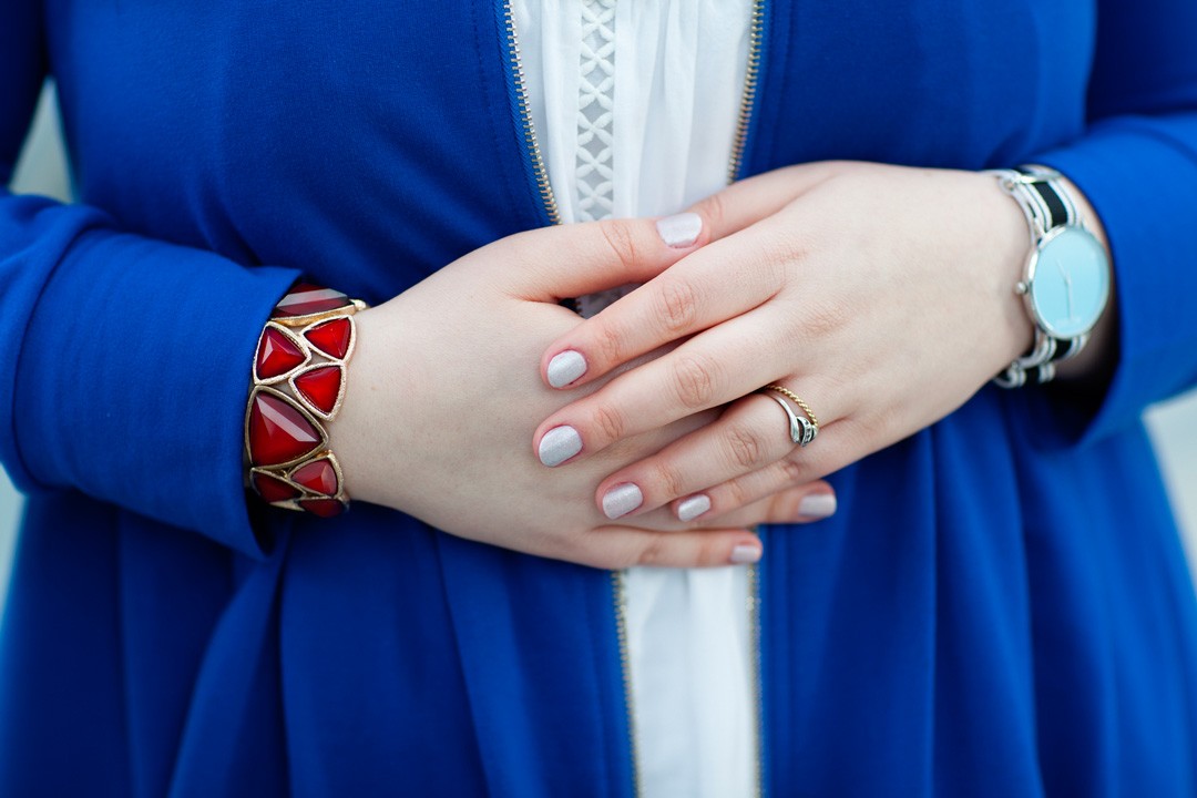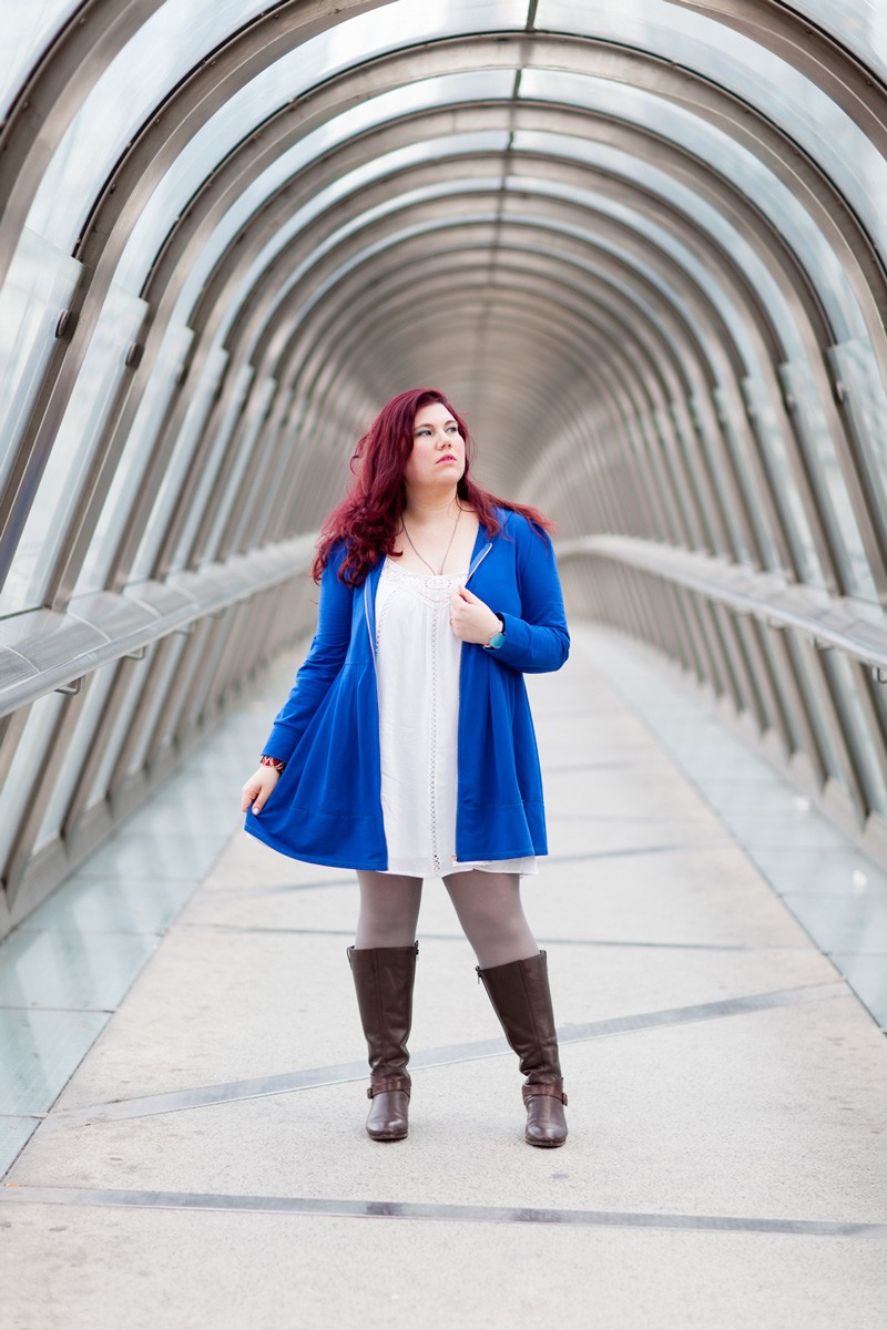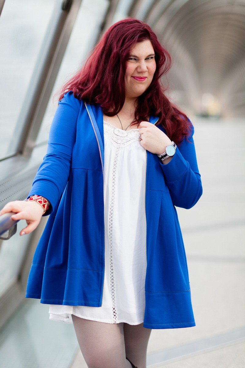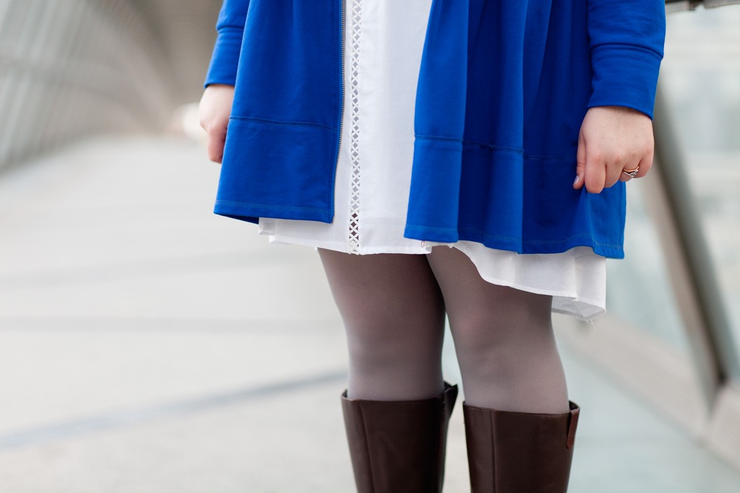 Je suis partie sur une interprétation girly, à l’esprit Jedi, avec un long gilet à capuche bleu roi, dont j’adore la forme, il pourrait être porté comme une petite robe. Une robe blanche style chemise de nuit avec de jolis inserts en dentelles. Des collant gris, et pour finir ma paire de bottes cavalières qui ajoutent un côté combattant Jedi. Je finis ma tenue avec un bracelet rouge pour rappeler le petit bouton rouge de R2D2.