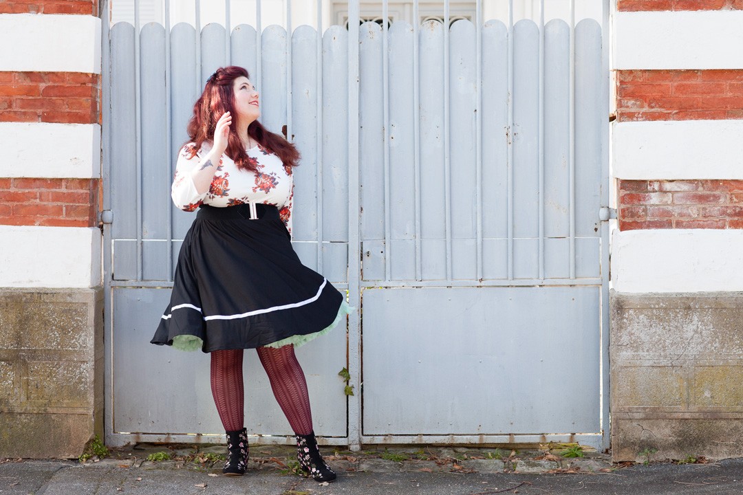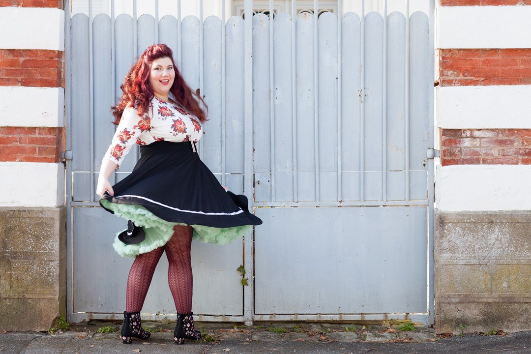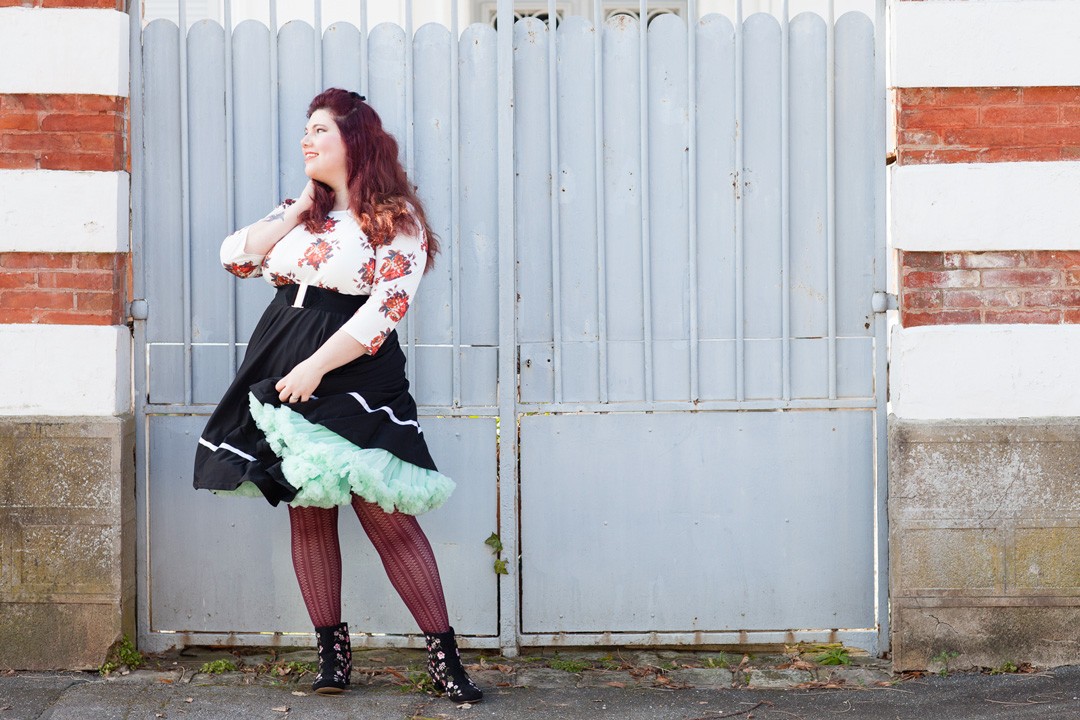 Une jolie robe qui donne envie de danser et de tourner, car la jupe noire laisse paraître un joli jupon vert menthe à l’eau. Ce que j’adore dans les jupons et tutus c’est qu’ils font une silhouette ultra féminine. Ils apportent aussi du volume aux jupes et robes patineuses, et ça donne de la prestance.