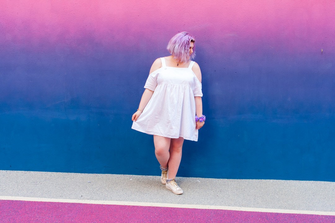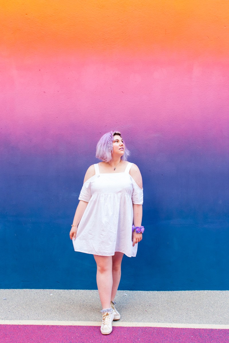 Les couleurs flamboyantes des murs qui rappellent un coucher de soleil d’été, mettent en valeur ma toute nouvelle robe blanche en broderie anglaise de chez Monki. Je suis totalement tombée sous le charme de cette petite robe, dès la première fois où je l’ai vue. Sa coupe ample, ses épaules nues, le motif de sa broderie, la souplesse de son coton. Elle est aussi très confortable, c’est un bonheur de la porter même quand il fait très chaud.