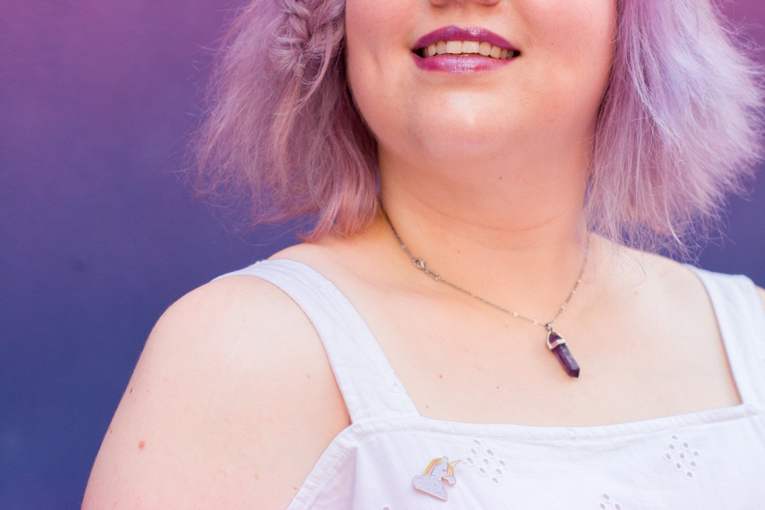 Côté accessoires, on retrouve un bracelet en cristal de verre et un collier améthyste, dans la tendance gemstone de la marque Happines Boutique qui est un e-shop de bijoux, à l’esprit joyeux et positif. J’adore les pierres semi-précieuses et leur effet énergétiques. Depuis très jeune j’ai toujours une améthyste près de moi, que ce soit sous la forme de pierre ou de bijoux. C’est ma pierre totem.